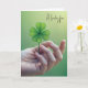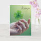 A hand delicately holds a four-leaf clover against a soft, blurred green background.