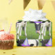 Holstein cow with a purple birthday party hat in a green farm pasture
