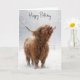 A Highland cow stands in a snowy landscape, sticking out its tongue to catch snowflakes. Its shaggy coat is covered in patches of snow, with its horns prominently visible.