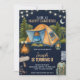 Birthday invitation featuring a camping theme. A tent sits under string lights with a crescent moon and pine trees. Text reads "Calling all happy campers! Joseph is turning 8." A campfire and lantern add warmth.