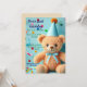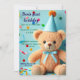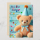 This invitation card features a cheerful and playful design, ideal for a child’s birthday party or a festive celebration. It showcases a cute teddy bear with light brown fur, wearing a blue party hat with a pom-pom at the top and a matching blue bow around its neck, also a light blue background adorned with colourful confetti dots and ribbon streamers, adding a vibrant and celebratory vibe.