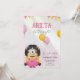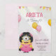 Birthday invitation for a child's sixth birthday featuring a cute cartoon character in a pink dress, with colourful balloons and celebratory text.