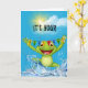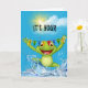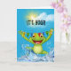 Green frog with birthday banner jumping out of blue water on sky background for a child's birthday.