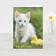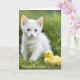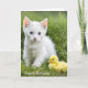 Cute white kitten in green grass with yellow spring duckling for friend's birthday.