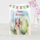 Watercolor Llama with heart-shaped glasses, flag garland, and a birthday hat with a desert landscape in the background. Inside is a birthday wish and a llama with colourful balloons