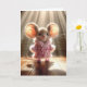 A cute mouse stands on a wooden floor wearing a pink robe and slippers illuminated by sunbeams.
