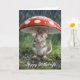 Cute mouse under a red and white polka dot mushroom in the rain.