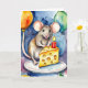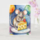 Cute mouse with a red birthday candle in a slice of cheese and party balloons.