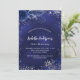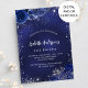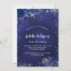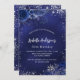 A navy blue background, decorated with faux silver glitter, sparkles and blue florals. The blue colour is uneven. Personalise and add a name and party details.