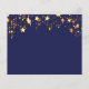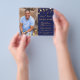 On front: Add a vertical size photo. A classic navy blue background colour, decorated with faux gold stars. Personalise and add a name and details. Golden letters. For both him and her.