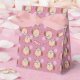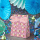 This awesome favour box features a cute brown owl with big sleepy eyes. The owl is holding a pretty pale pink balloon and a bouquet of bright pink flowers wrapped in a pale pink cone.