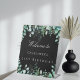 A welcome sign for an elegant and modern birthday paraty. A black background. Decorated with eucalyptus greenery, woodland ferns. Personalise and add a name, age/event.