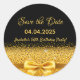 Elegant, classic, glamourous and feminine style party save the date sticker.  A faux gold coloured ribbon and bow with faux golden glitter and sparkle, a bit of bling and luxury for a birthday.  Black background. With the text: Save the Date written with a modern hand lettered style script.  Templates for the date and name/text.
