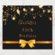 Elegant, classic, glamourous and girly style birthday label. Faux gold coloured ribbon and bow with golden stars dripping. Black background. With the text: 50th (or any age) Birthday. Personalise and add a name written with a modern hand lettered style script.