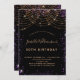 For an elegant 50th (or any age) birthday. A stylish black background. Decorated with purple faux gold glitter dust and a golden light strings. Personalise and add a name, age and party details. The name is written with a hand lettered style script