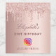 A sticker for a girly and glamourous 21th (or any age) birthday party. A rose gold background with blush drips, paint dripping look. The Instagram icon. Personalise and add a name, event and your Instagram event #hashtag.
