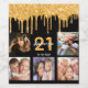 For a 21st (or any age) birthday party, celebrating her life with a collage of 5 of your own photos. Personalise and add a name, age 21 and a date. Date of birth or the date of the party. White and golden coloured letters. Classic black background colour, decorated with faux gold glitter drips, paint dripping look.