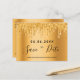 A modern and trendy Save the Date card for a 50th (or any age) birthday party. A faux gold metallic foil looking background decorated with faux gold glitter drips. On front: Personalise and add a date and name/age 50. Black coloured letters. The text: Save the Date is written with a large trendy hand lettered style script.