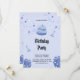 Invite your guests in style with this modern and playful birthday party invitation card! Featuring a pastel blue background filled with confetti, birthday hats, gift boxes, and a charming blue cake illustration, this invitation perfectly sets the tone for a fun celebration. The bold "Birthday Party" text stands out in a unique gothic-style font, while all essential event details are clearly laid out below. Personalise it for any birthday and impress your invitees with this vibrant, cheerful design!