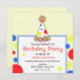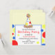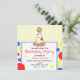 A birthday party invite featuring an illustration of a birthday hat with red, yellow, and blue polka dots at top. Background features matching polka dots. Personalise the text.