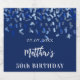 A label for a 50th (or any age) birthday party. A navy blue background with blue confetti. Personalise and add a date, name and age 50. The name is written with an elegant hand lettered style script.