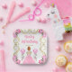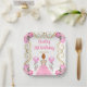 This birthday plate invitation features an elegant gold frame, a beautiful princess with red hair and a pink dress, flowers and a balloon. This is perfect for a birthday party.
