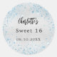 A faux silver looking background. Decorated with blue faux glitter, sparkles. Personalise and add a name and date. The name is written with a hand lettered style script