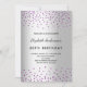 A modern, stylish and glamourous invitation for a woman's 30th (or any age) birthday party. A faux silver metallic looking background with purple faux glitter drops. The name is written with a black modern hand lettered style script. Personalise and add a name, age and party details.