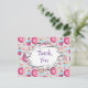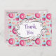 A personalised thank you postcard for your birthday party guests. Personalise with your name on the back. The front has a pattern of glazed pink doughnuts with sprinkles. Mouth watering cupcakes in pink and blue with rosettes and strawberries on top. Some pastel pink french pastry macarons and some little pink candy buttons. A fancy whimsical frame in the centre says "Thank You" in a cute font. The back has a birthday message all prepared, all you have to do is add your name.