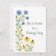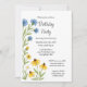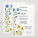 This birthday invitation features charming watercolor illustrations of blue bachelor buttons and vibrant yellow coneflowers, beautifully accented by lush green leaves. The colorful floral design is perfect for creating a warm and inviting atmosphere at any relaxed summer birthday celebration.