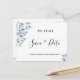 An elegant and simple Save the Date card for a 50th (or any age) birthday party. A chic white background decorated ice blue watercolored botanical florals. Templates for a date and name/age 50. Black coloured letters. The text: Save the Date is written with a large trendy hand lettered style script.