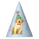Happy birthday greetings with this cute design featuring a happy, party hat-wearing Yellow Labrador Retriever puppy surrounded by colorful streamers.