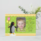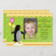 An adorabel unisex design featuring a penguin holding balloons. The green, polka dot background has a yellow/orange, scalloped awning and features the birthday child's photo.