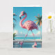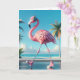 A pink flamingo wears a pair of headphones and pink sneakers while striding confidently along a scenic waterfront lined with palm trees.