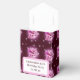 This favour box shows the pattern of a pink winged horse (Pegasus) in flight with magical lights all around. The stunning mythical creature also has some subtle shades of red and purple, with a beautiful pink, red, and purple gradient. The background is dark red. The front flap is pink, and there is customisable text on the front. It's perfect for favours in a Pegasus-themed event!