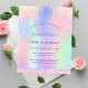 A girly and feminine 18th (or any age) birthday party invitation. On front: A rainbow, holographic coloured background in purple, pink, mint green, rose gold. Decorated with blush pink faux glitter drips, paint dripping look. Personalise and add a name and party details. The name is written with a hand lettered style script, purple coloured letters.