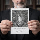 Beautiful black and white traditional Catholic line art image of the Sacred Heart of Jesus. Inside is the scripture verse "I shall go in to the altar of God, the God who gives joy to my youth" and a verse on the right side of the card.