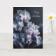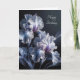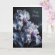Delicate blue and purple iris flowers with intricate petals appear against a dark background with wispy lines