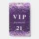 A modern, stylish and glamourous badge for a 21st (or any age) birthday party. A deep purple background with violet, pink confetti. The purple background colour is uneven. Personalise and add a name. The name is written with a modern hand lettered style script with swashes. The text: VIP Number 21. To keep the swashes only delete the sample name, leave the spaces or emoji's in front and after the name.