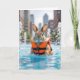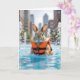 A rabbit wearing an orange life jacket is playfully wading in a city fountain, with skyscrapers and greenery visible in the background.