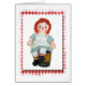 Rag doll sitting on an old wooden barrel with red and white gingham frame for general birthday.