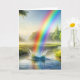 A vibrant rainbow arches into a serene river in a water splash surrounded by lush greenery and distant trees.