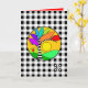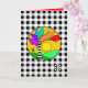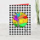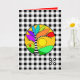 A happy (birthday!) circle on a background of black-and-white buffalo plaid encompasses a wondrously-striped and very colourful tree. Interior is bordered and coordinated for your writing pleasure and says, "May Your Birthday Be As Colourful As You!" ~ karyn