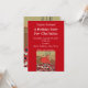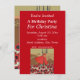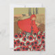 This flat card party invitation is vibrant red with a vintage image of little red riding hood in a red hooded cape picking red and black flowers from a field with the wolf off in the distance behind her. Customise all your information with the templates.