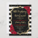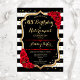 Birthday & Retirement Party Invitation. Elegant design in black, gold and red. Features black and white stripes, stylish script font, faux glitter gold and confetti. Perfect for a glam birthday & retirement joint celebration. Customise with your own details.