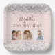 For a girly and glamourous 50th (or any age) birthday party. A rose gold gradient background decorated with faux silver confetti. The text: The name is written in dark rose gold with a large modern hand lettered style script. Personalise and add name, age 50 and 3 of your own photos of the birthday girl, her family, friends or pets.