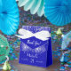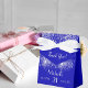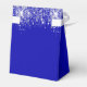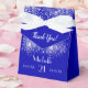 An elegant and glamourous blue and white 21st (or any age) birthday favour box. Royal blue coloured background with faux silver glitter dust. With the text: Thank You! Templates for a name, date of birth and date of anniversary and age number. White letters.