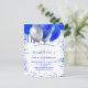 A white background. Decorated with royal blue faux glitter drips paint dripping look, sparkles. Royal blue and faux silver balloons. Personalise and add a name and party details. The name is written with a hand lettered style script.