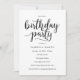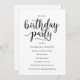 This birthday party invitation features the words "birthday party" in a modern black script with customisable text fields underneath where the party details are displayed. A gold heart sits at the bottom but can be deleted, if desired. Background can be changed to any colour.