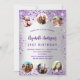 A girly and feminine 21st (or any age) birthday party invitation. On front: A trendy faux silver looking background. Decorated with dark purple faux glitter, sparkles. Personalize and add a name, party details and 6 photos. The name is written with a hand lettered style script, purple colored letters.